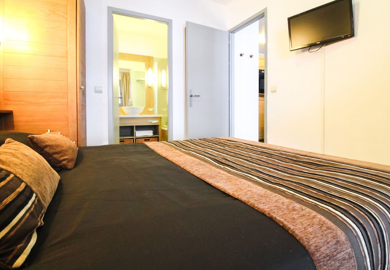Il se compose d'un salon et d'un coin repas avec une kitchenette, ouverts sur un balcon avec vue sur les pistes. La suite parentale est dotée d'une chambre double et d'une salle de bains attenante, tandis qu'une seconde chambre à deux lits simple dispose d'une salle de douche séparée.