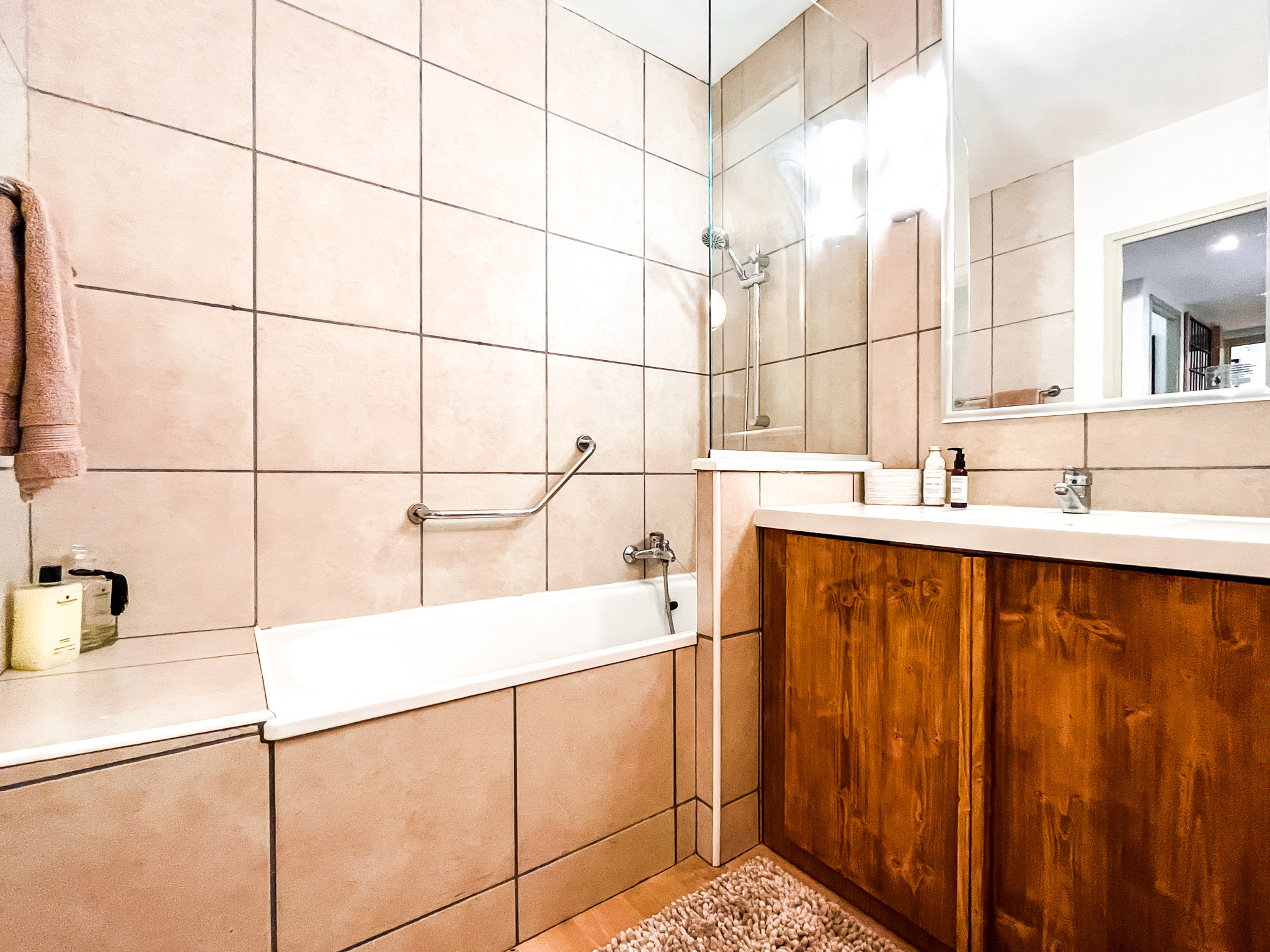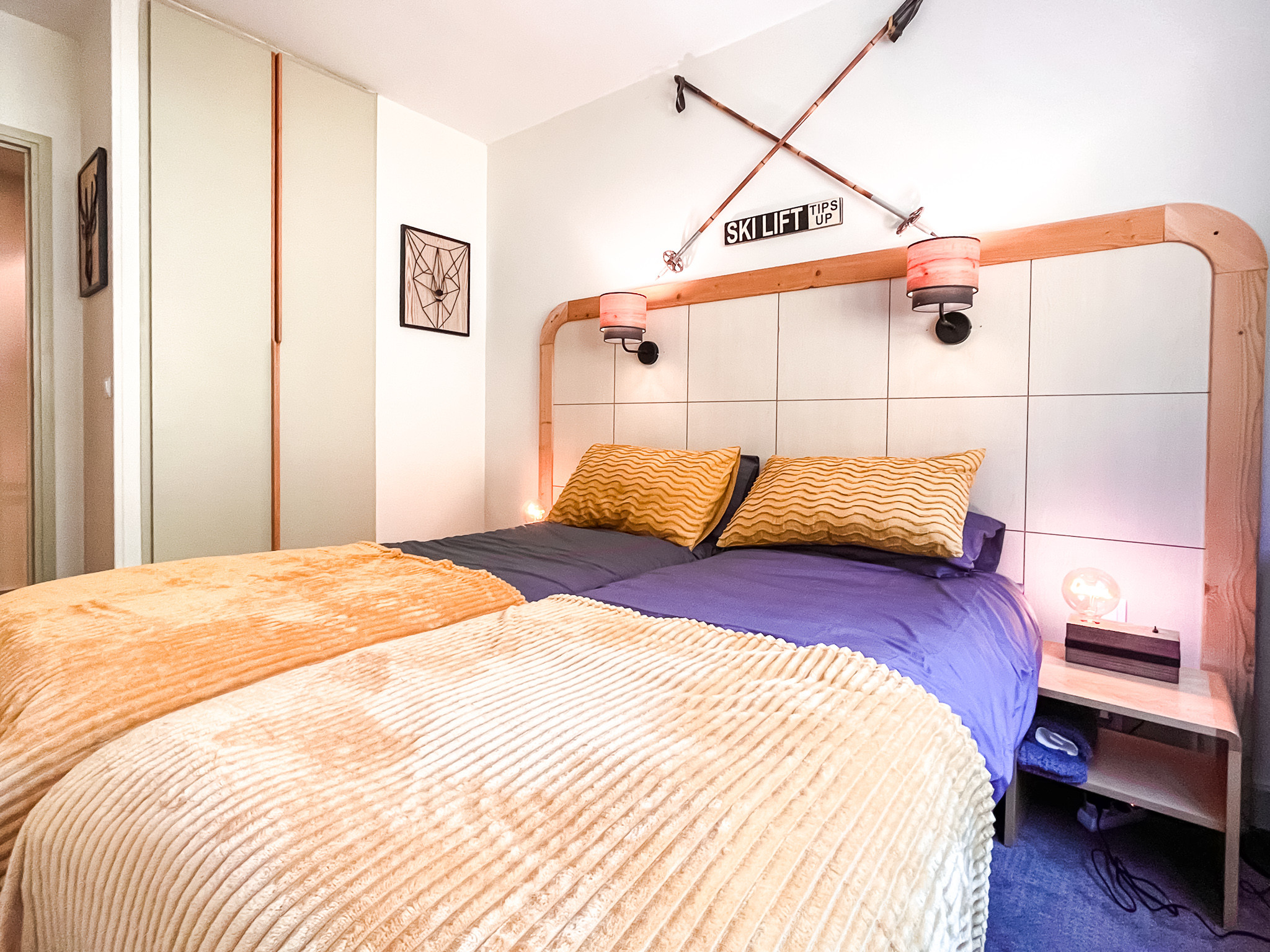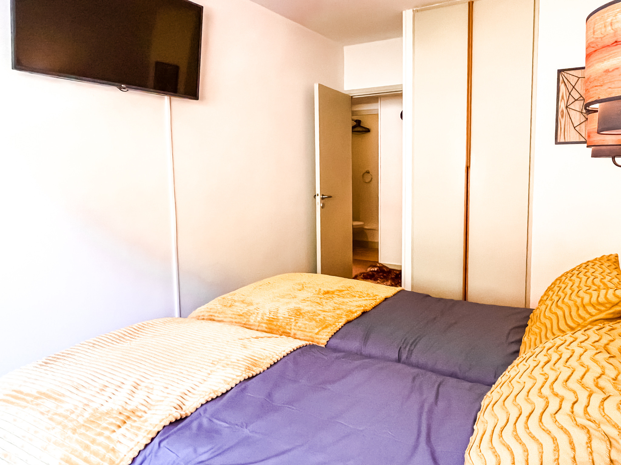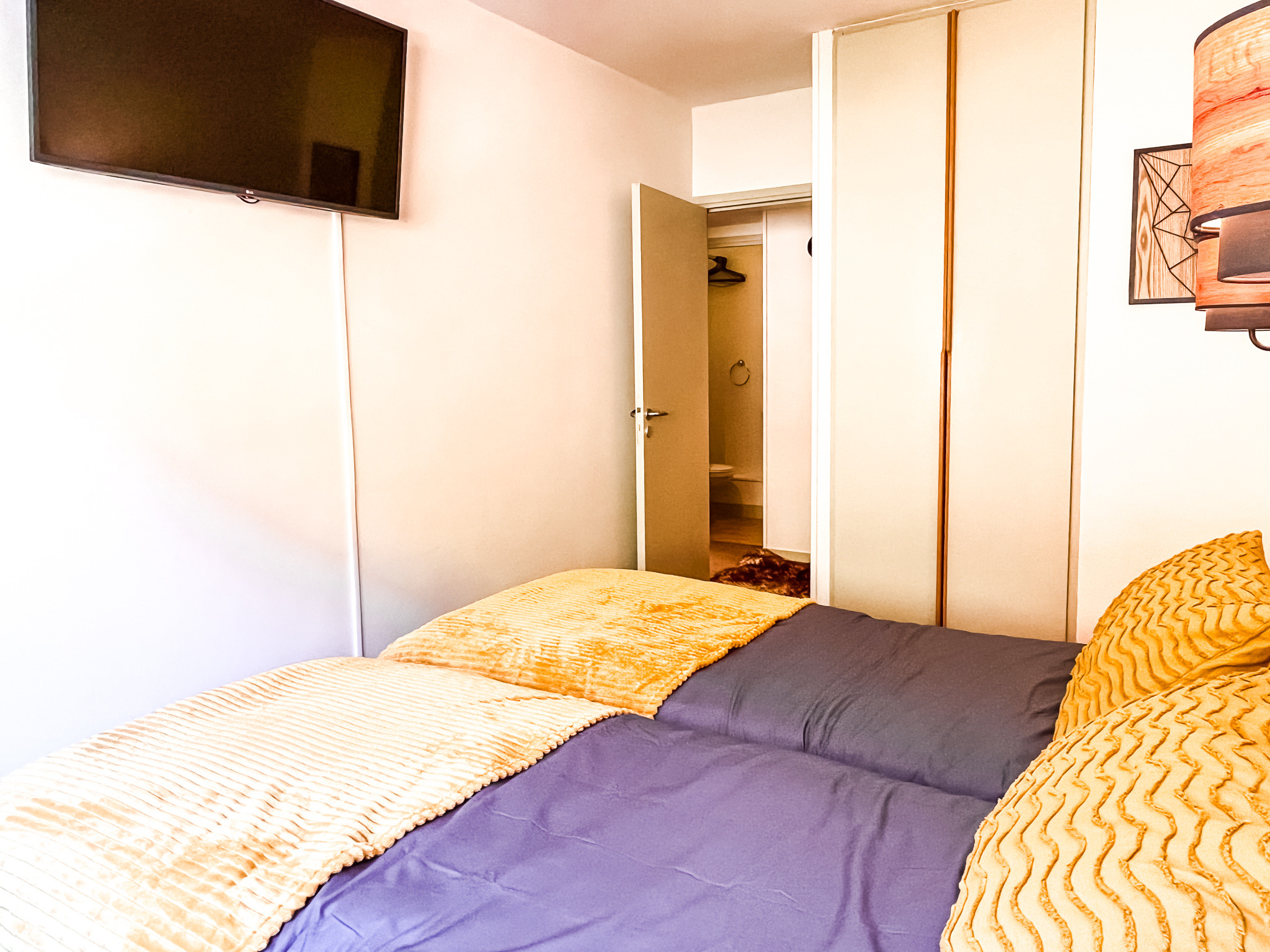 L'appartement comprend une chambre double, une chambre twin, une salle de bains avec WC, une salle de douche et un WC indépendant, un salon spacieux avec canapé lit et une cuisine bien équipée et fonctionnelle.