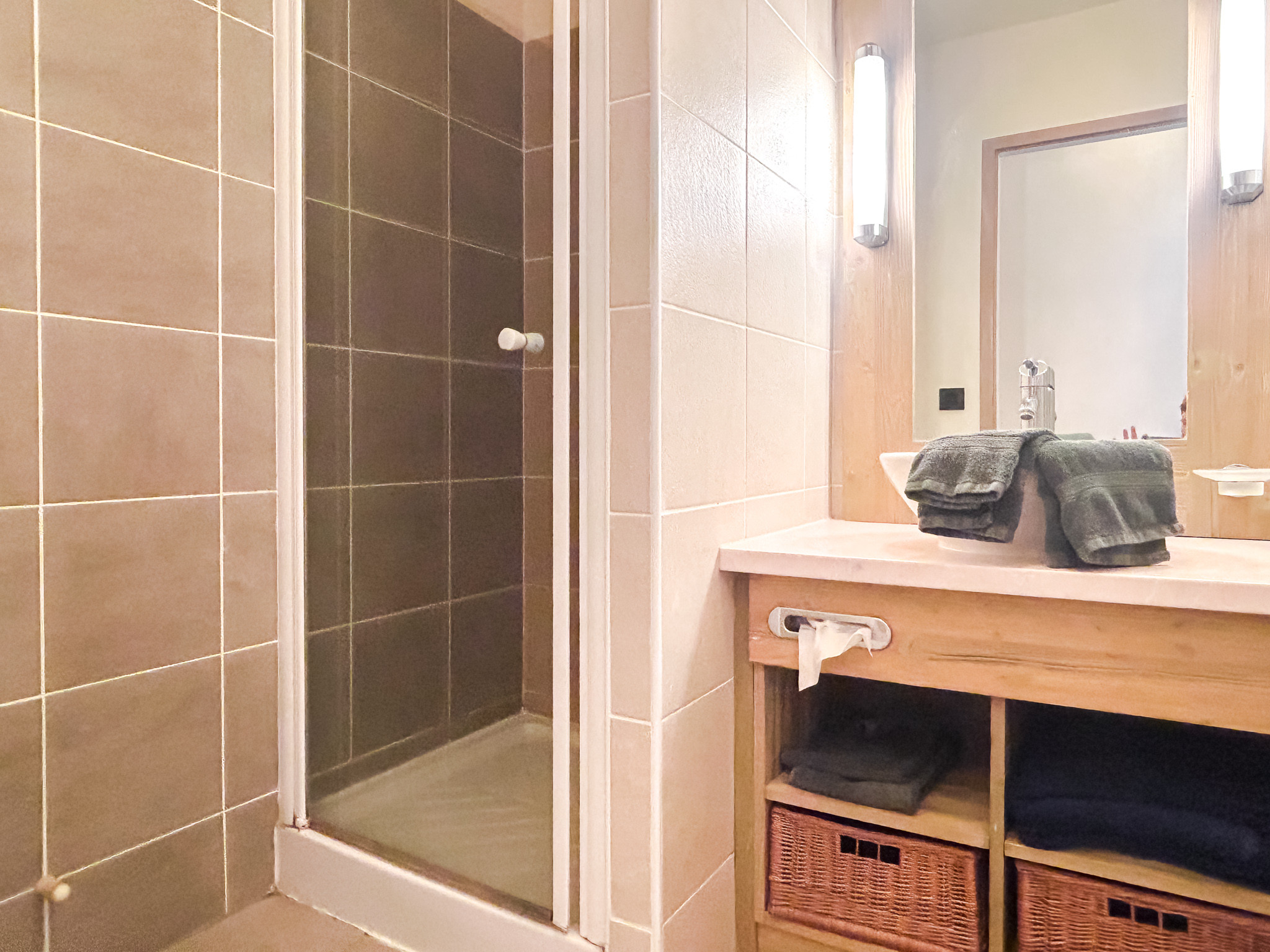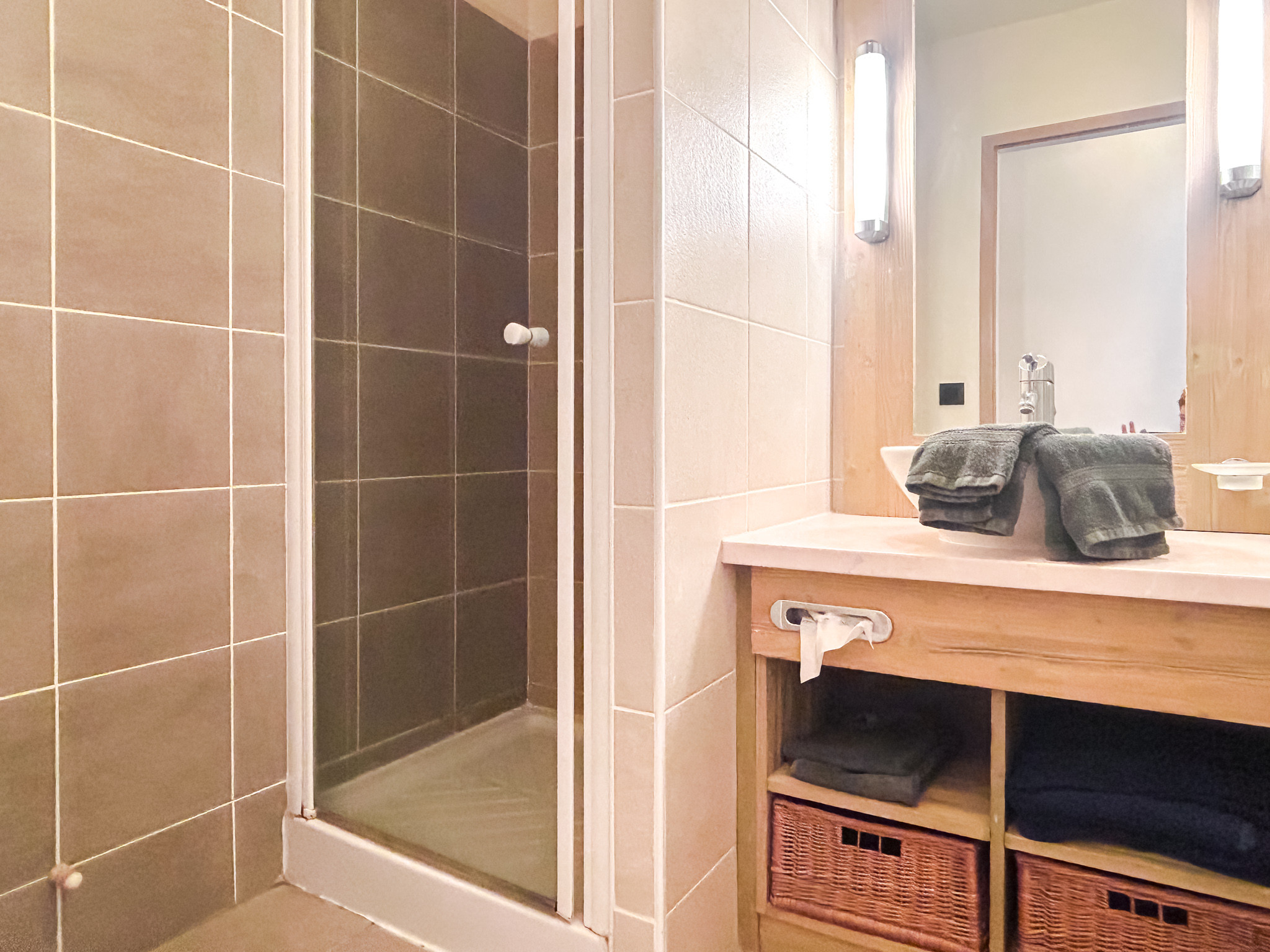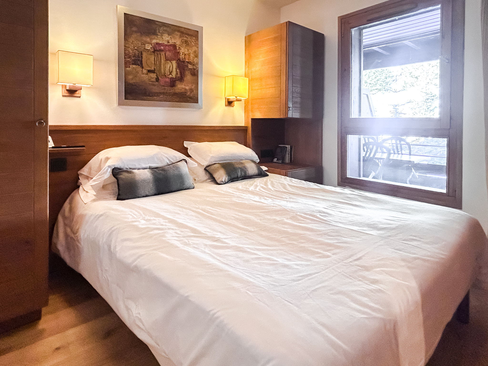 Located on the 5th floor of the Terrasses d'Eos residence, the apartment benefits from ski-ski ski-out access via the piste that runs behind the building (accessible directly from the ski locker room), a space in the building's private covered parking, and access to the swimming pool and sauna facilities on the ground floor.