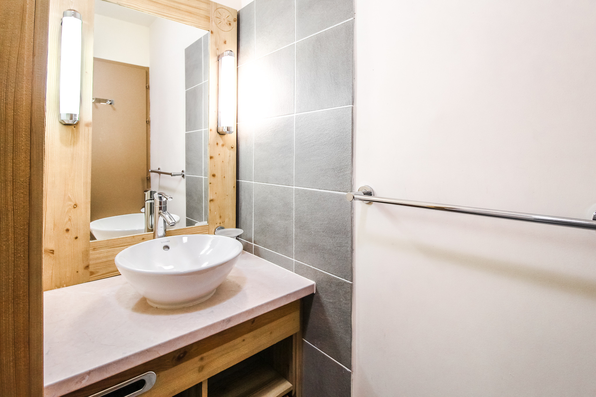 A very special 2-bedroom apartment, located on the 6th floor, with fireplace and a large open plan lounge with kitchenette and dining area. The huge floor to ceiling windows look out on a breathtaking view of the Flaine mountains, which can also be enjoyed from the balcony with a glass of champagne (or a cup of tea!).
